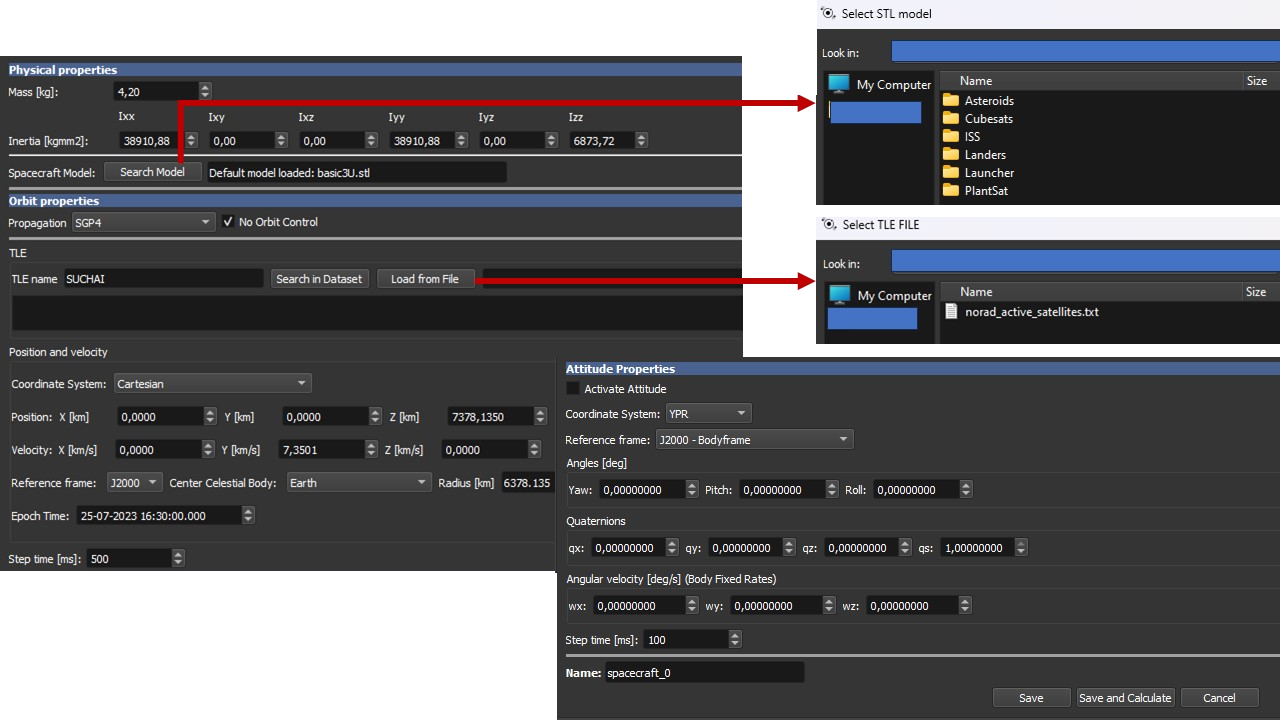 The Add Spacecraft tool allows you to define the properties of your model, including the option to load *.stl models into the 3d display. Among the properties you will find: